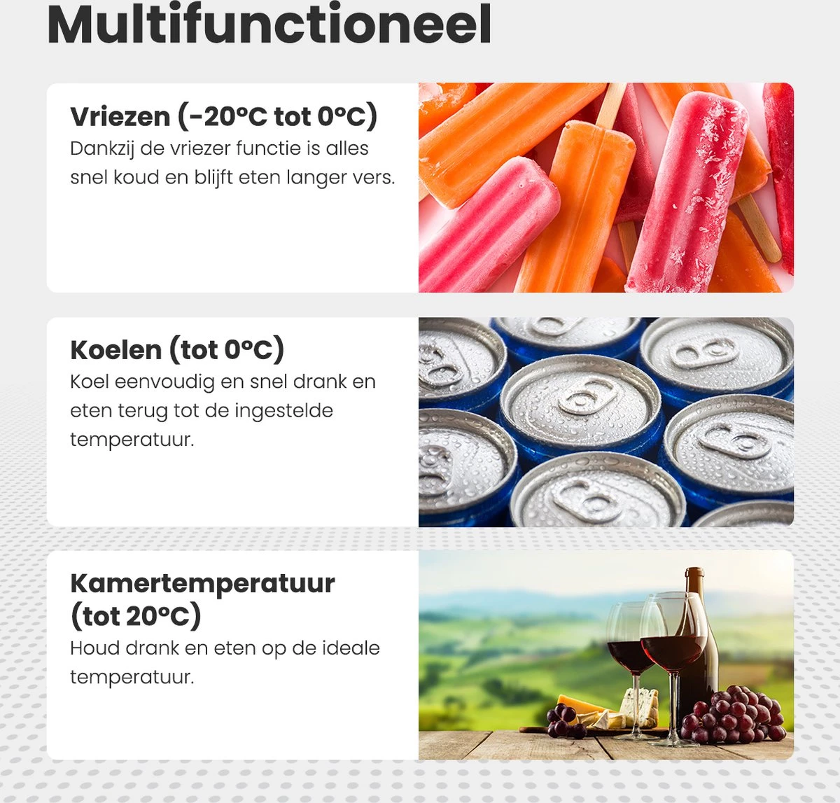 De elektrische koelbox is voorzien van verschillende standen, zoals een Max stand voor extra koeling en een Eco stand voor een lager stroomverbruik. Dit geeft je meer flexibiliteit en maakt het gemakkelijk om de koelbox aan te passen aan elke situatie. Met zijn compacte design is dit dé perfecte koelbox voor welke gelegenheid dan ook. Genoeg redenen dus om deze koelbox te kopen!