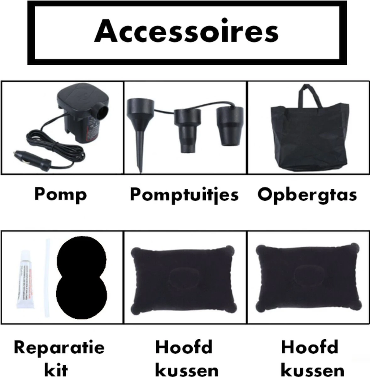De set bevat alle benodigdheden om het jou zo makkelijk mogelijk te maken. Zo komt de hele set in een passende opbergtas, bevat het een elektrische pomp met 3 opzetstukken, 2 opblaasbare hoofkussens, 2 opblaasbare ondersteuningskussen en een plakset.