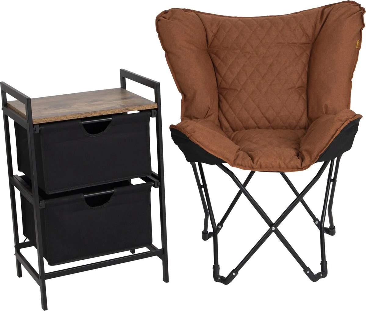 Kleur: bruin Materiaal: staal en kationiek weefsel Afmetingen (uitgeklapt): 85 x 66 x 92 cm (B x D x H) Breedte zitting: 68 cm Diepte zitting: 42 cm Hoogte zitting: 45 cm Hoogte rugleuning: 49 cm Gewicht: 3,5 kg Draagvermogen: 100 kg Inklapbaar Gevoerde zitting en rugleuning Inclusief draagtas Bo-Camp Industrial serie