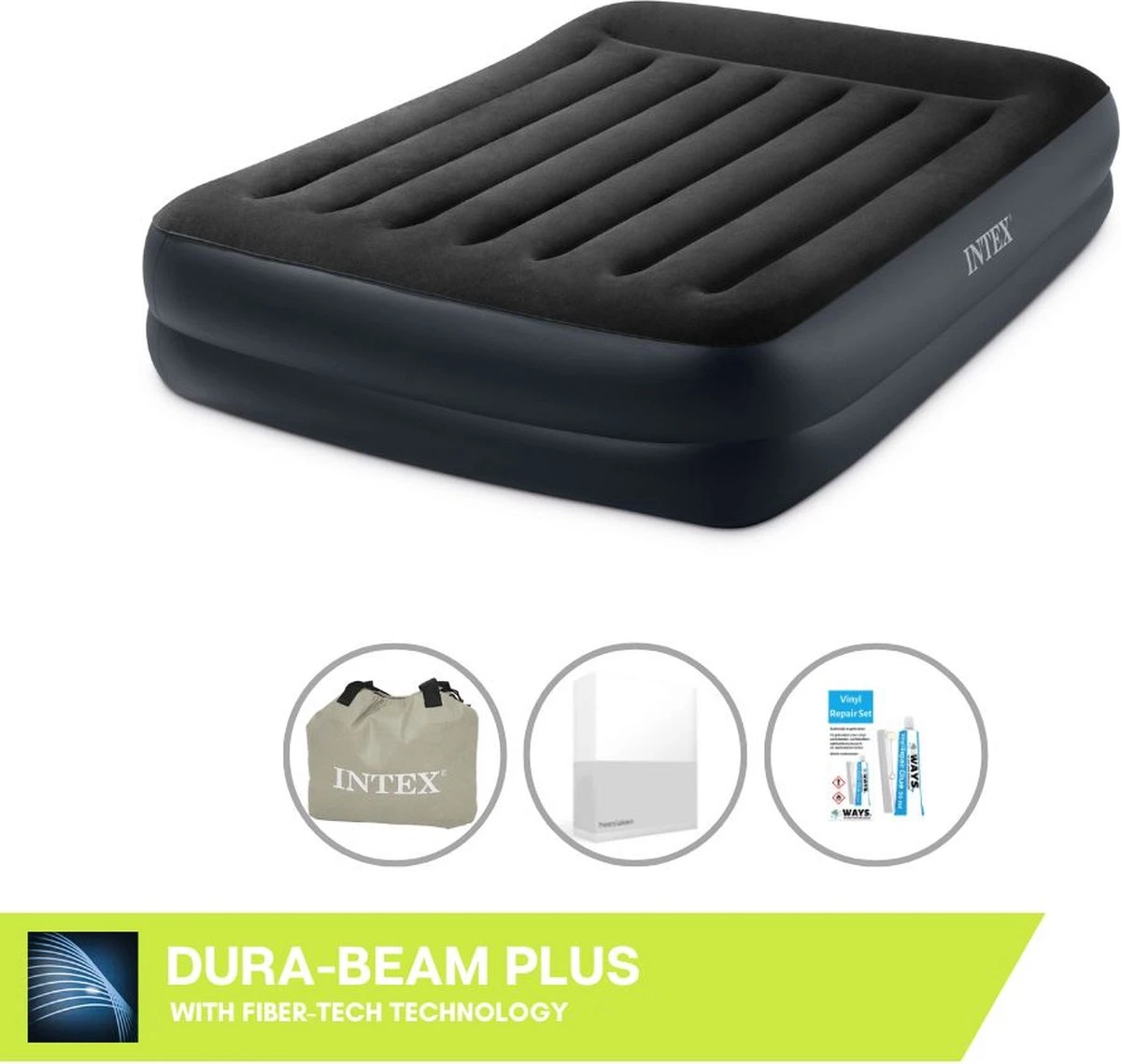 Intex Luchtbed – 2-Persoons – 152 X 203 X 42 Cm – Blauw – Met Pomp + Hoeslaken Wit + Reparatieset